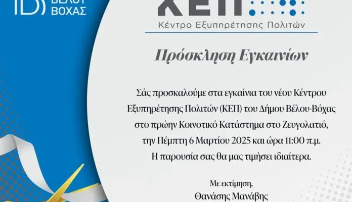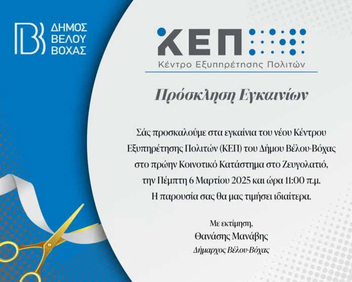 1_ΚΟΡΙΝΘΙΑΔΗΜΟΣ ΒΕΛΟΥ-ΒΟΧΑΣ Αύριο τα εγκαίνια του νέου ΚΕΠ στο Ζευγολατιό By SFEDONA 05/03/2025 ShareTweet 0 Τα εγκαίνια του νέου Κέντρου Εξυπηρέτησης Πολιτών (ΚΕΠ) στο Ζευγολατιό θα γίνουν αύριο (Πέμπτη) το πρωί, στις 11.00! Η έδρα του νέου ΚΕΠ είναι στο πρώην Κοινοτικό Κατάστημα Ζευγολατιού.