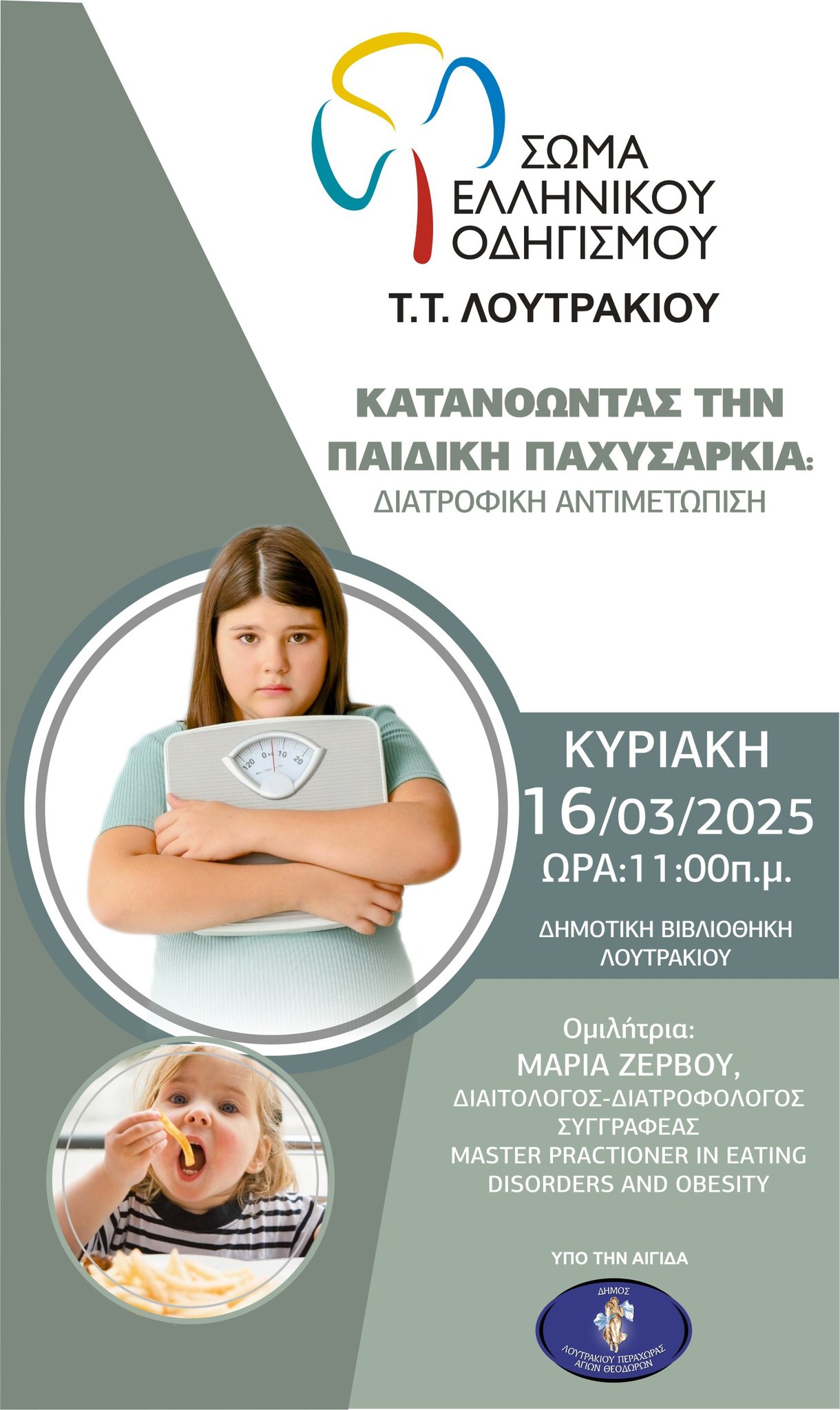 Το Σώμα Ελληνικού Οδηγισμού Τ.Τ. Λουτρακίου διοργανώνει μια σημαντική ενημερωτική εκδήλωση με τίτλο “Κατανοώντας την παιδική παχυσαρκία: Διατροφική αντιμετώπιση”, που στοχεύει στην ευαισθητοποίηση γονέων και παιδιών σχετικά με τη σωστή διατροφή και την αντιμετώπιση της παιδικής παχυσαρκίας.