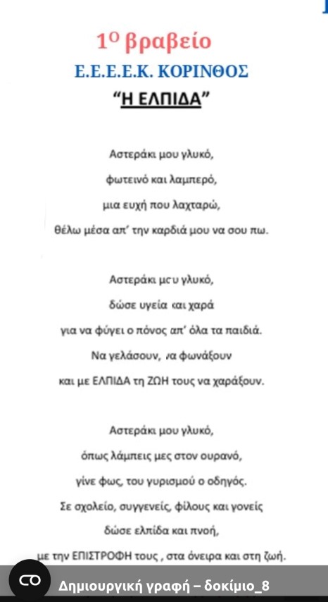 “Το σχολείο μας πήρε το 1ο βραβείο στην κατηγορία “δημιουργική γραφή- δοκίμιο” για ΕΕΕΕΚ στον διαγωνισμό του Make a Wish, Αστέρι της Ευχής. Συγχαρητήρια στους μαθητές και τις μαθήτριες μας !!! Ευχαριστούμε πολύ τις καθηγήτριες που ανέλαβαν τη συμμετοχή μας στο διαγωνισμό και καθοδήγησαν με μεράκι τους μαθητές μας. Το αποτέλεσμα μας δικαίωσε όλους”.