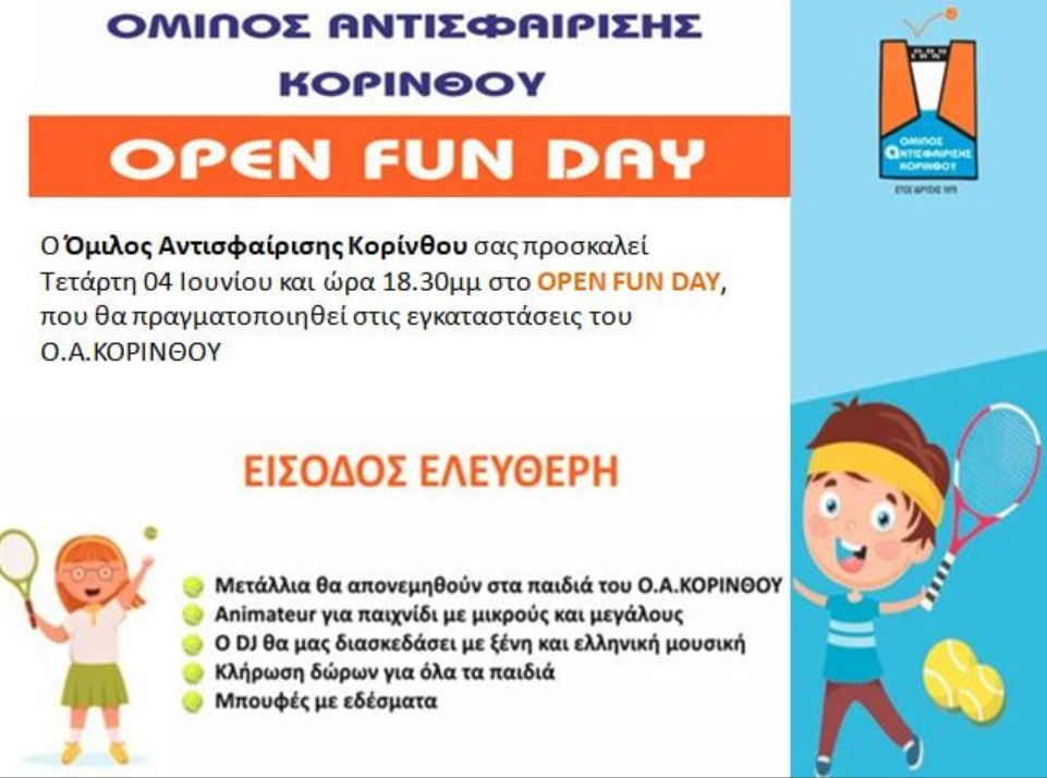 Την Τετάρτη 4 Ιουνίου 2025, στις 18:30 μ.μ., στις εγκαταστάσεις του Ο.Α. Κορίνθου, στο Δημοτικό Αθλητικό Κέντρο Κορίνθου, διοργανώνεται το OPEN FUN DAY – μια εκδήλωση ανοιχτή σε όλους, για μικρούς και μεγάλους φίλους του τένις!