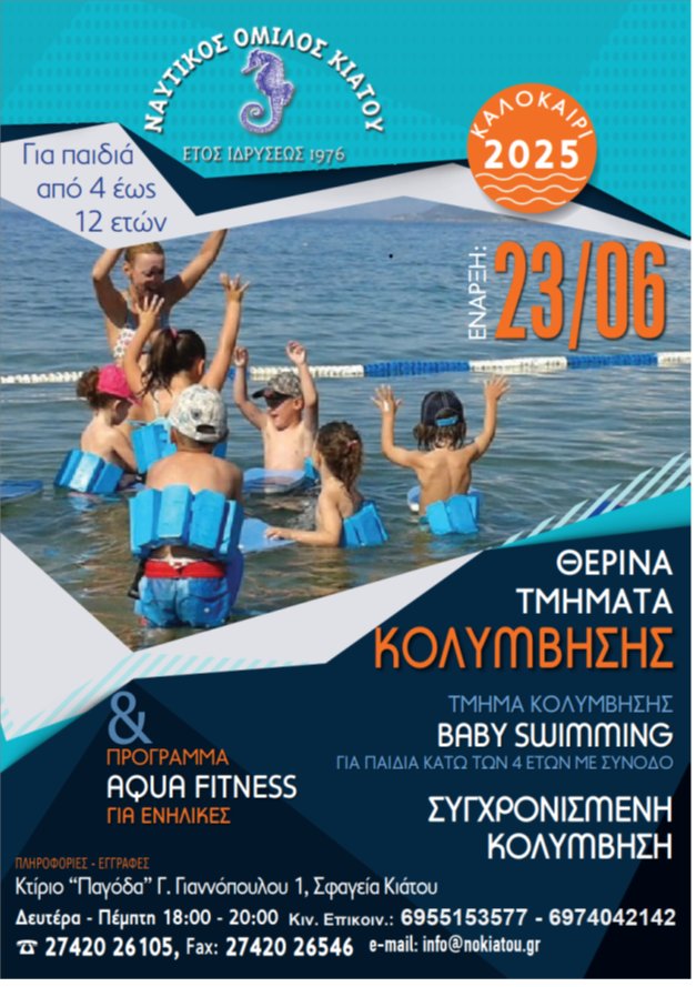 Το καλοκαίρι πλησιάζει και ο Ναυτικός Όμιλος Κιάτου είναι έτοιμος να υποδεχτεί παιδιά και ενήλικες στα θερινά του τμήματα κολύμβησης, προσφέροντας μια μοναδική εμπειρία άθλησης, ψυχαγωγίας και εξοικείωσης με το νερό.