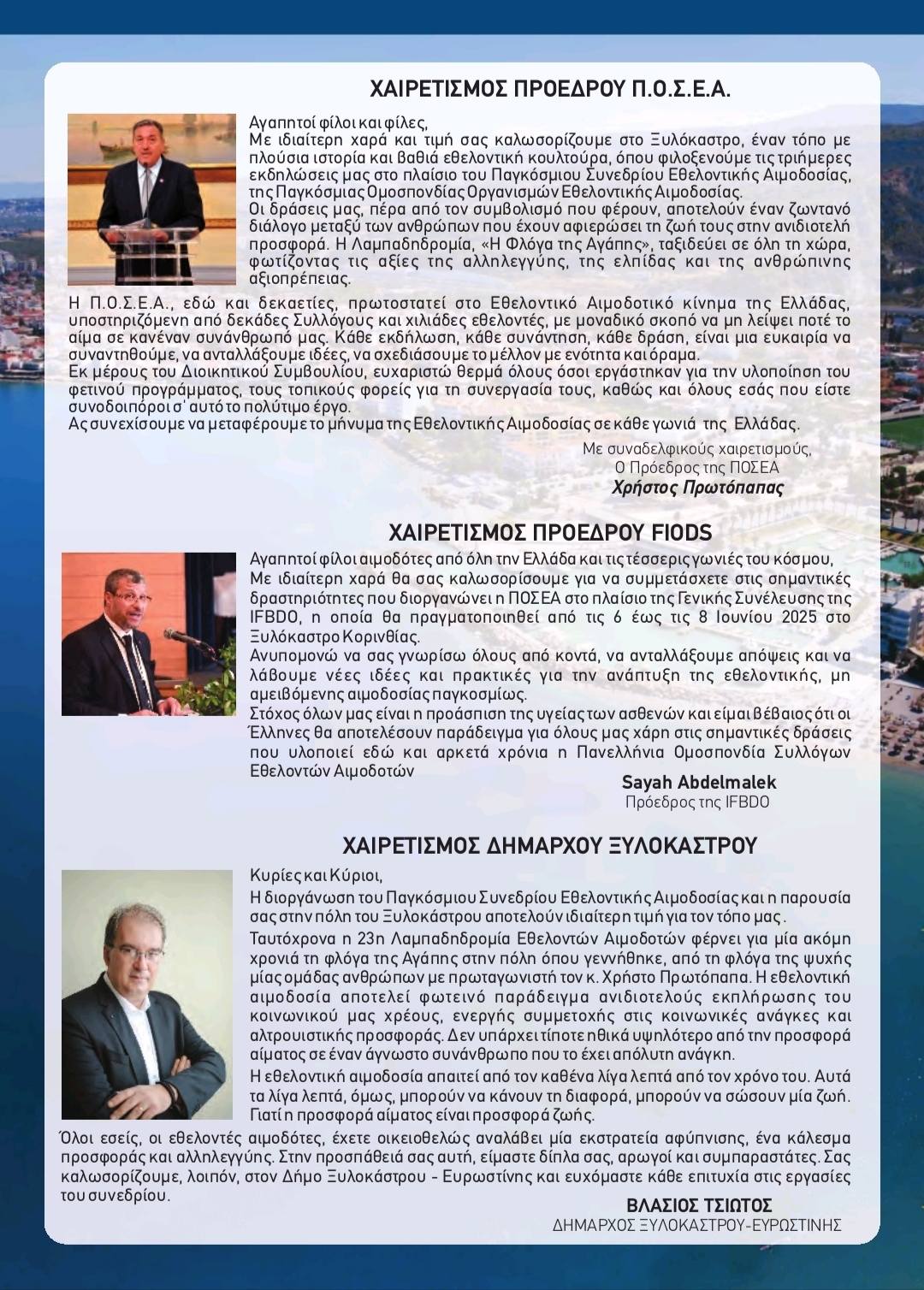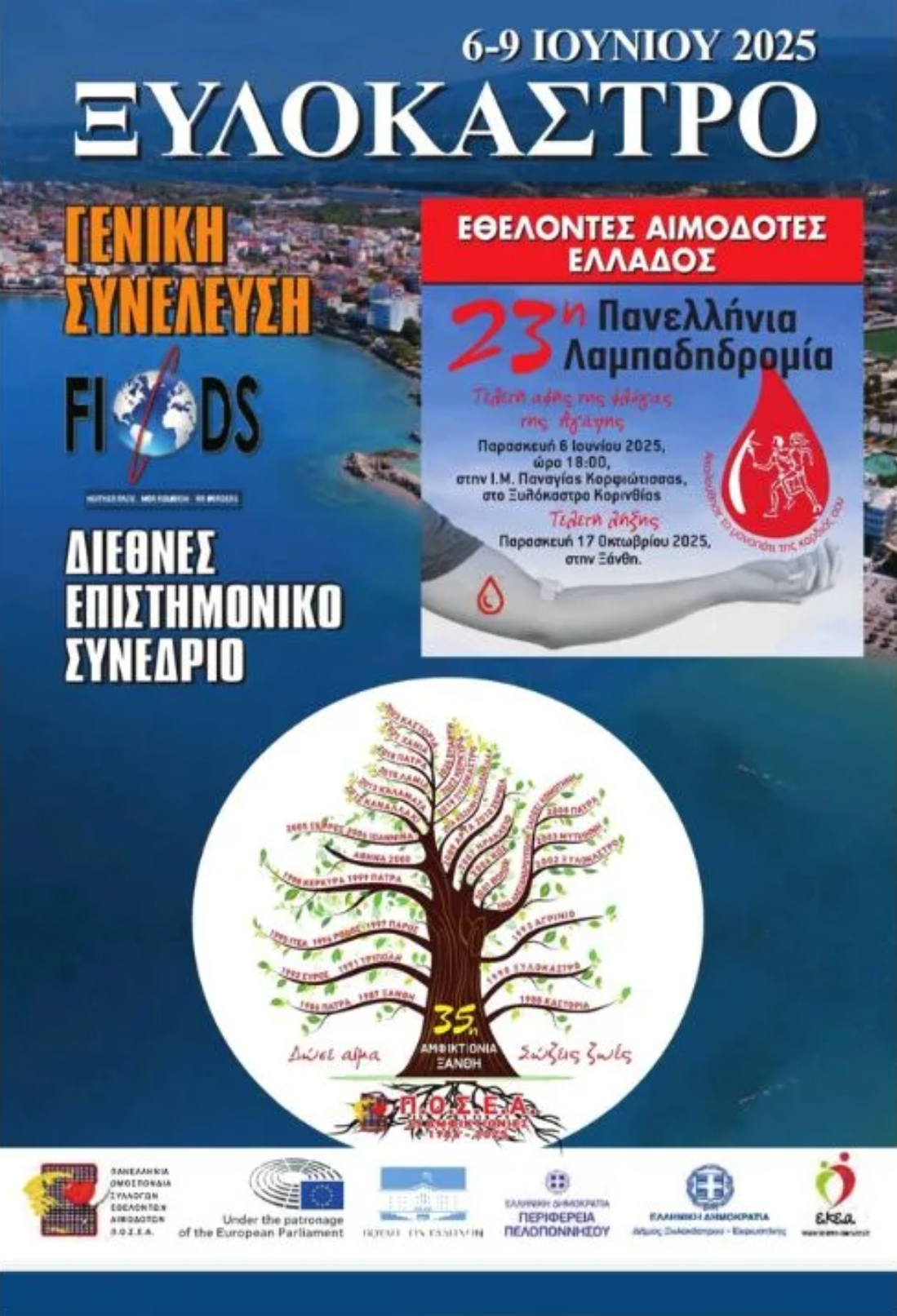 Το Συνέδριο, υπό την αιγίδα της Παγκόσμιας Ομοσπονδίας Οργανισμών Εθελοντικής Αιμοδοσίας (FIODS/IFBDO), θα πραγματοποιηθεί από τις 6 έως τις 9 Ιουνίου 2025, στο Ξυλόκαστρο.
