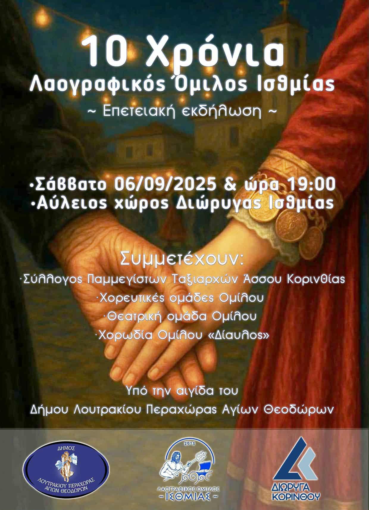 Ο Λαογραφικός Όμιλος Ισθμίας συμπληρώνει φέτος δέκα χρόνια πορείας και τιμά τη διαδρομή του με μια ξεχωριστή επετειακή εκδήλωση, το Σάββατο 6 Σεπτεμβρίου 2025, στις 19:00, στον μαγευτικό αύλειο χώρο της Διώρυγας Ισθμίας.