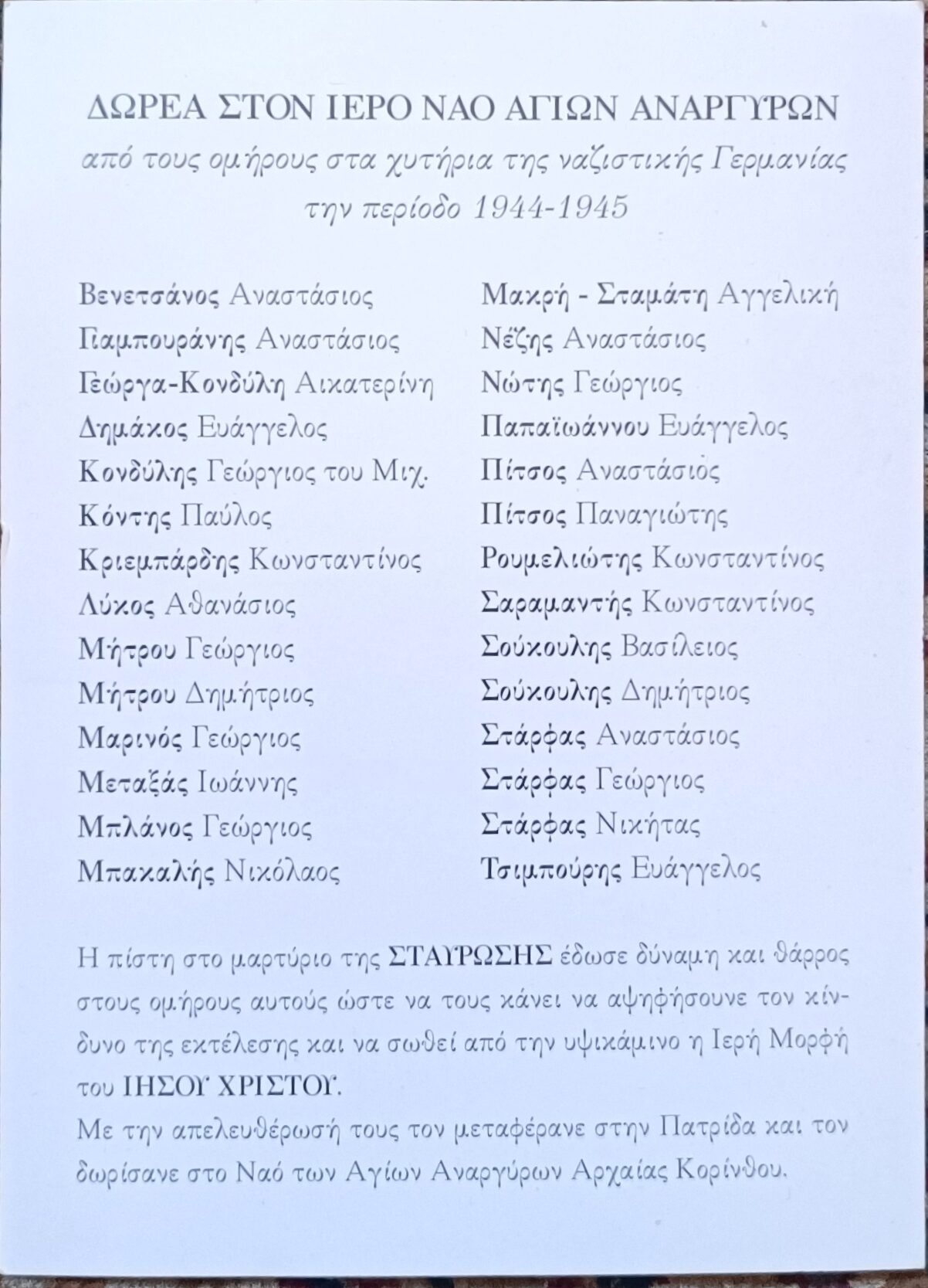 Στο πιο σκοτεινό διάστημα της κατοχής, λίγο πριν από την απελευθέρωση, οι Ναζί συνέλαβαν 29 κατοίκους της Αρχαίας Κορίνθου και τους έστειλαν σε χυτήρια μετάλλων. Μαζί τους είχαν έναν Σταυρό, τον οποίο αφιέρωσαν στους Αγίους Αναργύρους, ως τάμα να τον επιστρέψουν εφόσον γυρνούσαν ζωντανοί. Πάνω σε αυτόν χάραξαν τα ονόματά τους, ως αιώνιο σύμβολο των μαρτυρίων τους.