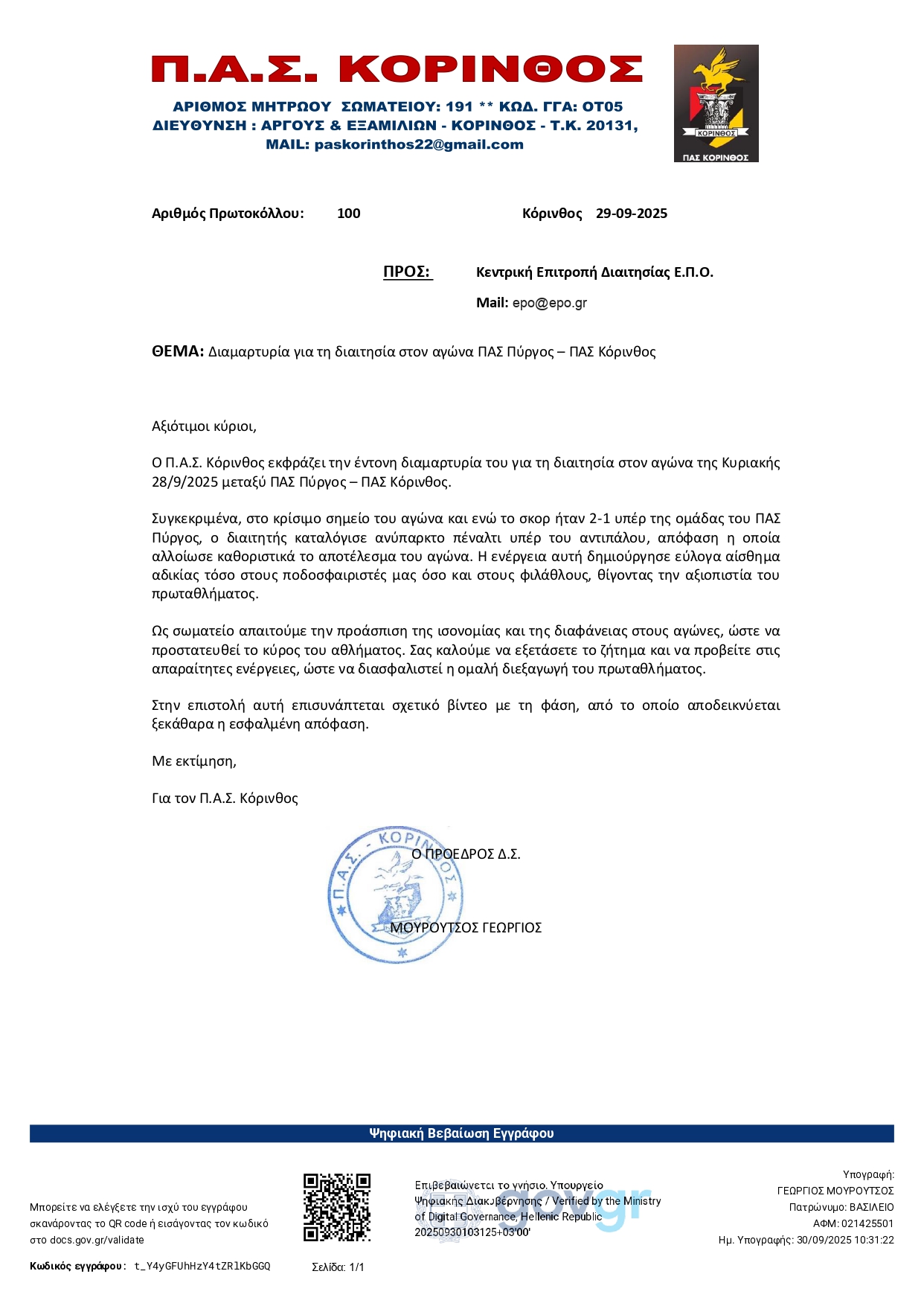Ο ΠΑΣ Κόρινθος δεν θα κάτσει σιωπηλός μπροστά σε τέτοιες αποφάσεις που πλήττουν την προσπάθεια των ποδοσφαιριστών του και την αξιοπιστία του πρωταθλήματος. Στην Κ.Ε.Δ. της Ε.Π.Ο. έχει ήδη αποσταλεί σχετική διαμαρτυρία, συνοδευόμενη από βίντεο της φάσης.