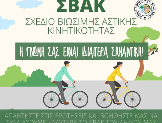 Η ομάδα εργασίας που θα δημιουργήσει μαζί με τους πολίτες και τους φορείς του Δήμου Ξυλοκάστρου – Ευρωστίνης το Σχέδιο Βιώσιμης Κινητικότητας για το Δήμο μας, προσκαλεί όλους τους κατοίκους, επαγγελματίες, φορείς —ανεξαρτήτως ηλικίας— να συμπληρώσετε ένα σύντομο ερωτηματολόγιο.