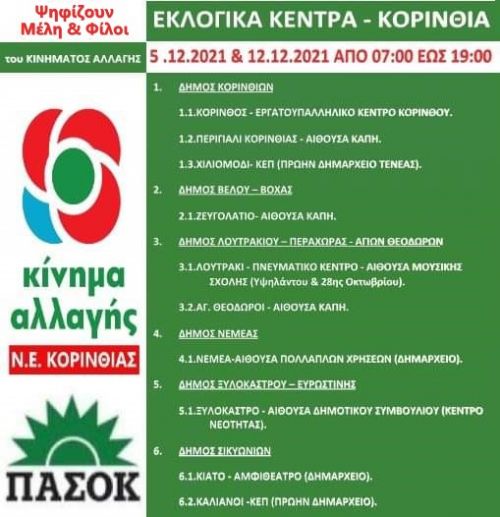Τα μέλη και οι φίλοι του Κινήματος Αλλαγής που θα βρίσκονται στην Κορινθία τις ημέρες των εκλογών μπορούν να ψηφίσουν στα παρακάτω Εκλογικά Κέντρα: