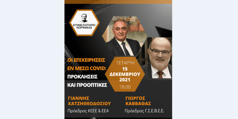 Το Επιμελητήριο Κορινθίας, με γνώμονα την προάσπιση των συμφερόντων των μελών του, διοργανώνει ανοικτή συζήτηση με θέμα: «Οι επιχειρήσεις εν μέσω Covid-19: Προκλήσεις και Προοπτικές» την Τετάρτη 15 Δεκεμβρίου 2021 και ώρα 18:00μ.μ.