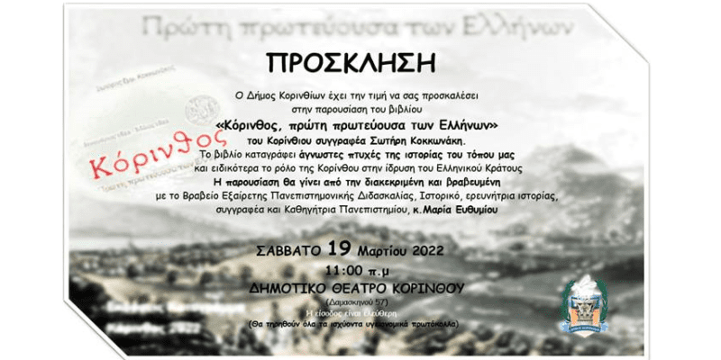 Ο Δήμος Κορινθίων έχει την τιμή να σας προσκαλέσει στην παρουσίαση του βιβλίου «Κόρινθος, πρώτη πρωτεύουσα των Ελλήνων» του Κορίνθιου συγγραφέα Σωτήρη Κοκκωνάκη.