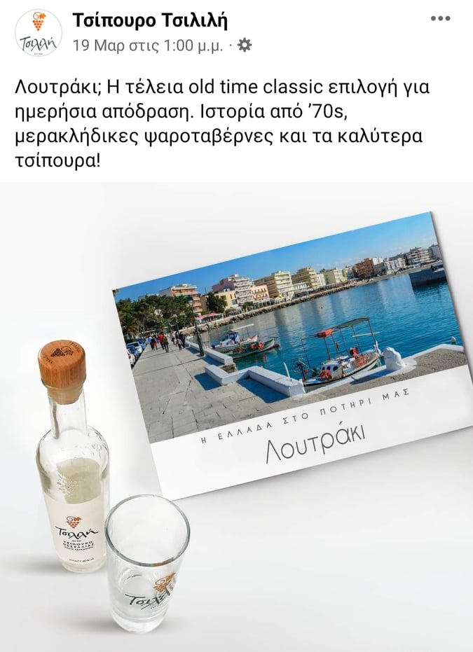 Το πασίγνωστο Τσίπουρο Τσιλιλή προτίμησε εν όψει τριημέρου 25ης Μαρτίου, Πάσχα και καλοκαιρινής σεζόν, να διαφημίσει το προϊόν διαφημίζοντας ταυτόχρονα το Λουτράκι!