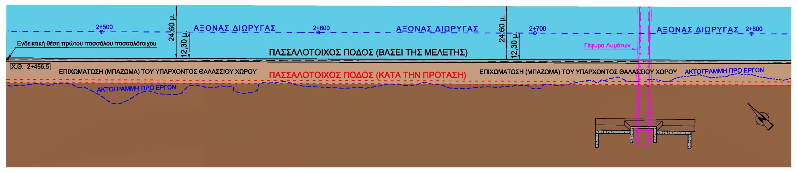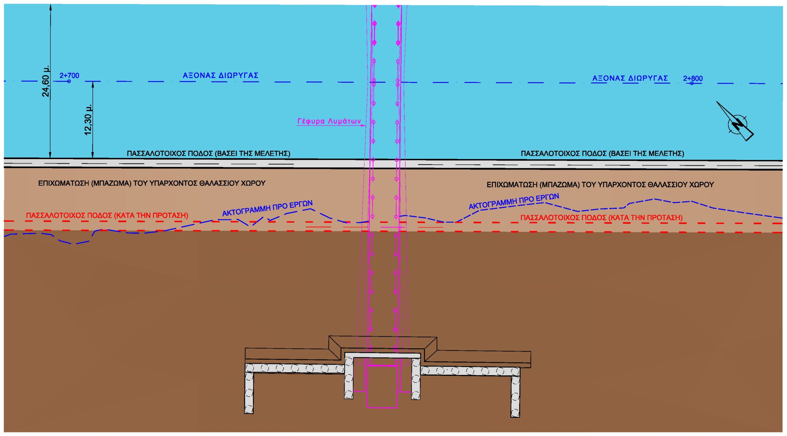 Α) για την διατήρηση της σημερινής γέφυρας των λυμάτων και την προστασία του βάθρου αυτής με διπλό πιόσχημο διάφραγμα πέριξ αυτού από πασσάλους βάθους 30,0μ. με