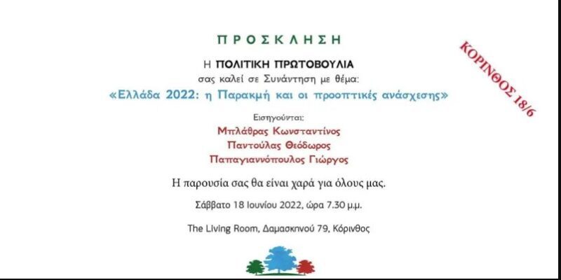 Μία ενδιαφέρουσα πολιτική εκδήλωση θα πραγματοποιηθεί αύριο, Σάββατο (18 Ιουνίου 2022), στις 7.30 το απόγευμα στο αίθριο του cafe Living Room, (Δαμασκηνού 79 Κόρινθος).