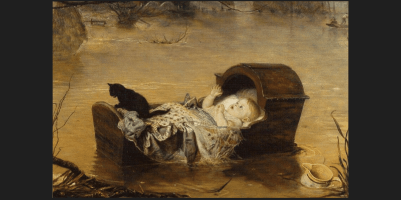 Και μετά ανακάλυψα άλλους δύο πίνακες με την ίδια ιστορία: Τον “A-Flood” – η πλημμύρα του Sir John Everett Millais (1829-1896) του 1870. Ο πίνακας βρίσκεται στην Πινακοθήκη του Μάντσεστερ. O Millais ήταν Βρετανός ζωγράφος του 19ου αιώνα και ένας από τους ιδρυτές της Αδελφότητας των “Προ Ραφαηλιτών” που είναι ένα κίνημα στην αγγλική ποίηση και ζωγραφική στο δεύτερο μισό του 19ου αιώνα, που σχηματίστηκε στις αρχές του 1850 θέλοντας να αντιταχθεί κατά των κανόνων της βικτοριανής εποχής, της ακαδημαϊκές παραδόσεις και την τυφλή μίμηση κλασικών μοντέλων (όσοι πιστοί ψάξτε το, πως ένα μικρό κίνημα άλλαξε τον κόσμο της τέχνης, όπως τον βλέπουμε σήμερα). Πιστεύεται ότι η ιδέα για αυτόν τον πίνακα ήταν η τραγωδία που συνέβη τον Μάρτιο του 1864 στο Σέφιλντ. Λέγεται ότι και σε αυτή την περίπτωση συνέβη το ίδιο, μια γάτα να ένα σώζει μωρό.