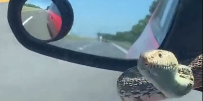 Το βίντεο προκαλεί σοκ, ειδικά αν σκεφτεί κανείς πως το φίδι εμφανίστηκε πρώτα στο δεξιό καθρέφτη του αυτοκινήτου της οδηγού και στη συνέχεια άρχισε να κάνει βόλτες όσο το ΙΧ ήταν εν κινήσει.