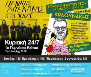 Δύο από τους πιο αγαπητούς Έλληνες καλλιτέχνες φέρνει στο Κιάτο ο οικείος Εμπορικός Σύλλογος. Ειδικότερα, στο πλαίσιο των πολιτιστικών εκδηλώσεων “Σικυώνια 2022” την Κυριακή 24 Ιουλίου στο 1ο Γυμνάσιο Κιάτου θα γίνει συναυλία του Γιάννη Αγγελάκα και του συγκροτήματος «100ο C», ενώ στις 4 Αυγούστου στον ίδιο χώρο έρχεται ο Σταμάτης Κραουνάκης και η παρέα του.