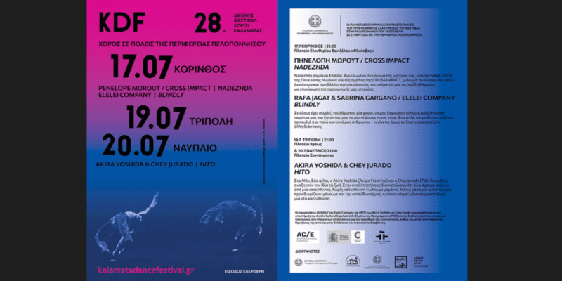Στην πρωτεύουσα του νομού μας, θα «φιλοξενηθεί» μεθαύριο Παρασκευή 15 Ιουλίου το 28ο Διεθνές Φεστιβάλ Καλαμάτας. Τον θεσμό συνδράμει ενεργά και η Περιφέρεια Πελοποννήσου μέσω τριετούς προγραμματικής σύμβασης με το υπουργείο Πολιτισμού και τον Δήμο Καλαμάτας. Φέτος θα γίνουν δωρεάν παραστάσεις στην Κόρινθο, την Τρίπολη και το Ναύπλιο. Ειδικότερα, σύμφωνα με το πρόγραμμα , την ερχόμενη Κυριακή 17 του μήνα θα παρουσιαστούν στην Κόρινθο, στην πλατεία Ελευθερίου Βενιζέλου (“Φλοίσβος”), στις 9 το βράδυ, τα έργα “Blindly” της ομάδας Εlelei Company και “Nadezhda” της Penelope Morout και της ομάδας Cross iMPact.