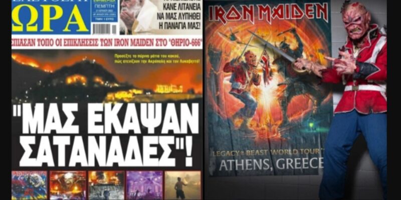 Κι αυτό γιατί ούτε λίγο, ούτε πολύ, η συγκεκριμένη εφημερίδα χρεώνει τη φωτιά στην Πεντέλη στους Iron Maiden και στην συναυλία που έκαναν τις προηγούμενες μέρες στο Ολυμπιακό Στάδιο.