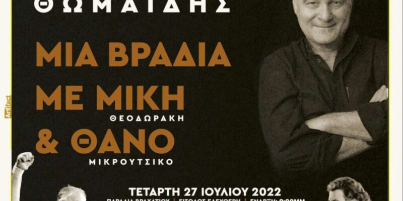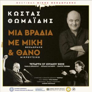 Την Τετάρτη 27 Ιουλίου ο Κώστας Θωμαΐδης συναντά τον Μίκη και τον Θάνο. Αφιέρωμα στον Μίκη Θεοδωράκη και τον Θάνο Μικρούτσικο. Συμμετέχουν η ορχήστρα δωματίου “Respira” και η χορωδία Opus Femina.