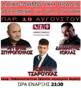 ΕΚΔΗΛΩΣΕΙΣ Σήμερα Δημοτική μουσική βραδιά στην Νεμέας αφιερωμένη στη Φιλιώ Πυργάκη By SFEDONA 19/08/2022 ShareTweet 0 Εκδηλώσεις στο Δήμο Νεμέας σήμερα Παρασκευή 19 Αυγούστου Λαϊκό – Δημοτική μουσική βραδιά Αφιερωμένη στη Φιλιώ Πυργάκη στη Λεωφ. Παπακωνσταντίνου (πλησίον Δημαρχείου Νεμέας) Ώρα έναρξης 21.30