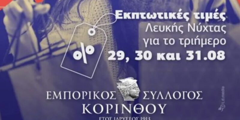 Ύστερα από δύο χρόνια «ανάπαυλας», λόγω της πανδημίας, η Λευκή Νύχτα, η μεγάλη γιορτή των εμπόρων της Κορίνθου έρχεται και στην πρωτεύουσα του Νομού. Και μάλιστα πιο δυναμικά από κάθε άλλη φορά καθώς η φετινή περίοδος της Λευκής Νύχτας έχει τρίμερη διάρκεια, αν και η κορύφωση της είναι αύριο, με τα καταστήματα να είναι ανοιχτά όλη μέρα, μέχρι αργά το βράδυ!