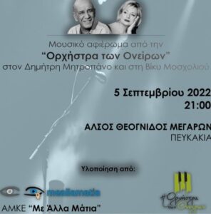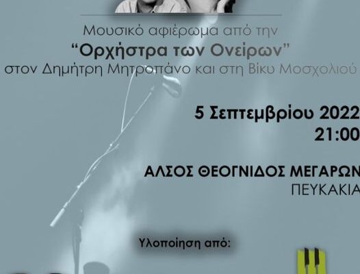 Την Δευτέρα 5 Σεπτεμβρίου Ωρα έναρξης: 9 μ.μ. στο Άλσος Θεόγνιδος (Πευκάκια) Μεγάρων, συναυλία – μουσικό αφιέρωμα στον Δημήτρη Μητροπάνο και την Βίκυ Μοσχολιού, στο πλαίσιο της “13η ΜΕΓΑΡΩΝ ΓΗ”
