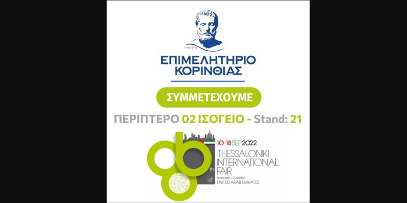 Το Επιμελητήριο Κορινθίας, δίνει και φέτος το «παρών», στην Διεθνή Έκθεση Θεσσαλονίκης, αυτό το Σάββατο 10 έως την Κυριακή 18 Σεπτεμβρίου 2022, με τιμώμενη Χώρα τα Ηνωμένα Αραβικά Εμιράτα.