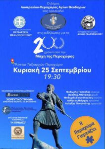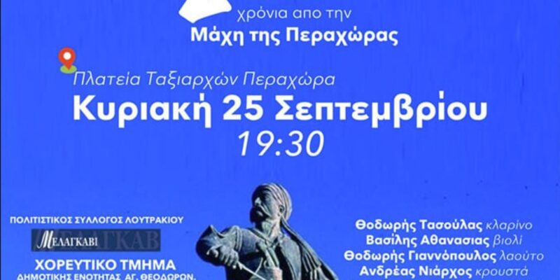 Ο Δήμος Λουτρακίου – Περαχώρας – Αγίων Θεοδώρων σας προσκαλεί στις εκδηλώσεις για τα 200 χρόνια από τη Μάχη της Περαχώρας την Κυριακή 25 Σεπτεμβρίου & ώρα 19:30 στην Πλατεία Ταξιαρχών, στηνΠεραχώρα.