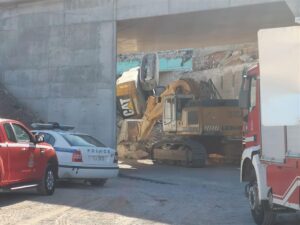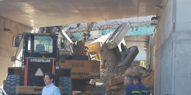 Συγκεκριμένα, κατά τη διάρκεια εργασιών συντήρησης και επισκευής της παλιάς γέφυρας στον κόμβο Νέας Περάμου κατέρρευσε τμήμα αυτής μαζί με τα εκσκαφτικά μηχανήματα που πραγματοποιούσαν εργασίες.
