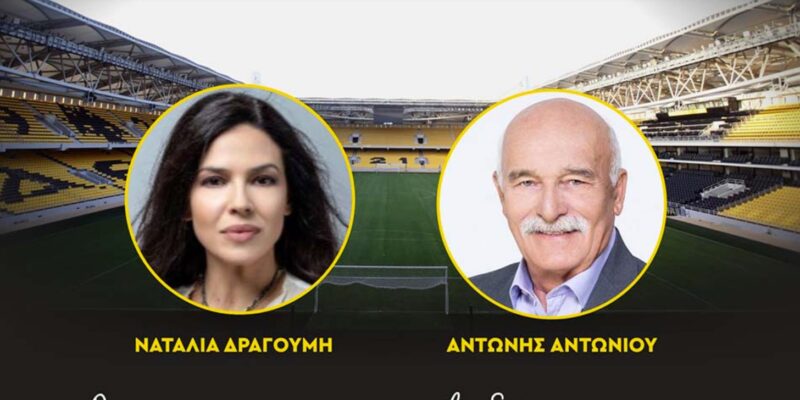 Παράλληλα δύο καταξιωμένοι ηθοποιοί, ο Αντώνης Αντωνίου και η Ναταλία Δραγούμη, θα είναι οι παρουσιαστές της βραδιάς των επίσημων εγκαινίων του γηπέδου της ΑΕΚ όπως γνωστοποίησε η “κιτρινόμαυρη” ΠΑΕ με σχετική της ανάρτηση.