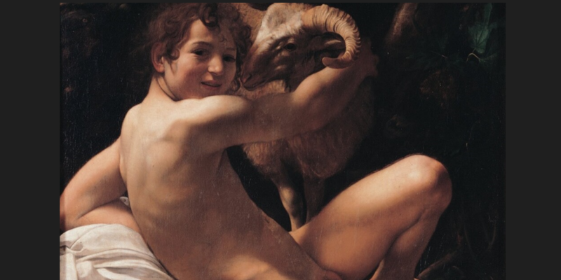 Οι θόρυβοι σβήνουν και το μυαλό μου βυθίζεται εντελώς σε αυτό το παιχνίδι φωτός και σκότους, ιδιωτικού και δημοσίου, ιερού και πρόστυχου, στο οποίο ο Καραβάτζιο έχει την ικανότητα να μας εμπλέκει στο λεπτό. Ένα αγόρι μισοξαπλωμένο, σχεδόν υποβασταζόμενο από τον λαιμό ενός τράγου, κοιτάει κατευθείαν προς τους θεατές με ένα αινιγματικά παιχνιδιάρικο χαμόγελο. Ο Ιωάννης ο Βαπτιστής του Καραβάτζιο. Δεν υπάρχει τίποτα στον πίνακα που να συμβολίζει την αγιότητά του… ούτε σταυρός, ούτε δερμάτινη ζώνη, μόνο ένα μικρό κομμάτι από δέρμα καμήλας μπλεγμένο ανάμεσα στις πληθωρικές πτυχές της κόκκινης κουβέρτας (αντικείμενο προφανώς από το στούντιο του Καραβάτζιο) που κείτεται στα πόδια του μικρού και του τράγου.