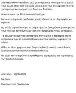 Κατά την έναρξη της συνεδρίασης του χθεσινού δημοτικού συμβουλίου στο Λουτράκι, η Πρόεδρος, Σ. Κορδαλή, ανέγνωσε την επιστολή παραίτησης/αποποίησης του αντιδημάρχου του Κώστα Παντελέου, στην οποία κάνει λόγο για φασιστική συμπεριφορά εκ μέρους του δημάρχου λέγοντας ότι «αποφασίζει και διατάζει», μιλά για «αυλή» που κινείται γύρω του και άλλα