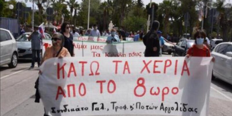-Μόνιμη και σταθερή δουλειά με δικαιώματα για όλους. Μείωση του εργάσιμου χρόνου. 7ωρο – πενθήμερο – 35ωρο. Να σταματήσει κάθε δραστηριότητα των δουλεμπορικών γραφείων.