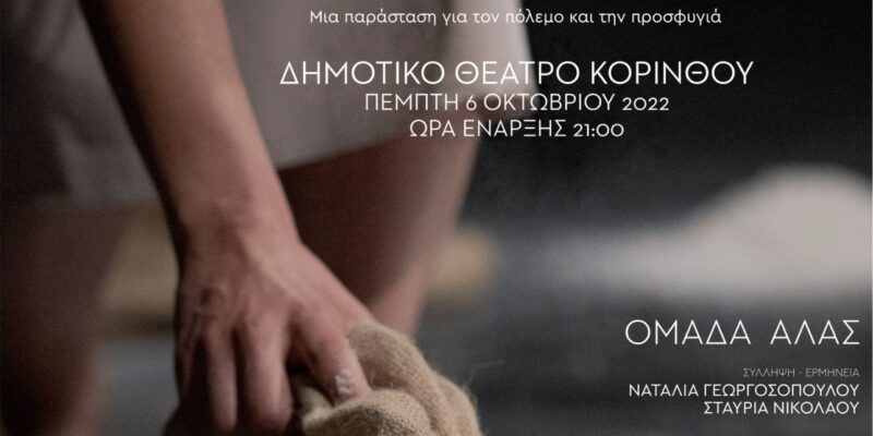 Την Πέμπτη 6 Οκτωβρίου και ώρα 9.00 το βράδυ στο δημοτικό θέατρο Κορίνθου η ομάδα ΑΛΑΣ παρουσιάζει μία παράσταση για τον πόλεμο και την προσφυγιά με τίτλο “ΑΛΜΥΡΗ ΕΡΗΜΟΣ”.