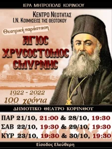 Η εφηβική θεατρική σκηνή του Κέντρου Νεότητας του Ιερού Ναού Κοιμήσεως της Θεοτόκου Ιωνίας Κορίνθου με αφορμή τα 100 χρόνια μνήμης από τη μικρασιατική καταστροφή, ανεβάζει τη θεατρική παράσταση «Άγιος Γεώργιος ο Χιοπολίτης» την Κυριακή 12/6 και τη Δευτέρα 13/6 στις 8.00μ.μ. στο Δημοτικό Θέατρο Κορίνθου.