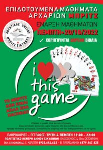 Μπες με την παρέα σου στον συναρπαστικό κόσμο του μπριτζ. Δήλωσε τώρα συμμετοχή ή ζήτησε περισσότερες πληροφορίες για τις νέες σειρές μαθημάτων που ξεκινούν.