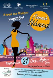 Την Παρασκευή 21 Οκτωβρίου ο Εμπορικός σύλλογος Μεγάρων με την υποστήριξη του δήμου Μεγαρέων της Περιφέρειας Αττικής και της Δημοτικής κοινότητας Μεγάρων, διοργανώνει “Λευκή Νύχτα”.