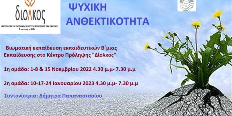 Ο “Δίολκος” , το Κέντρο πρόληψης του νομού μας ξεκίνησε χθες την εκπαίδευση των εκπαιδευτικών Β΄θμιας Εκπαίδευσης με το σεμινάριο που διοργάνωσε με θέμα “Ψυχική ανθεκτικότητα” και στόχο την ενδυνάμωση των εκπαιδευτικών στον πολύπλευρο και απαιτητικό, παιδαγωγικό ρόλο τους, μέσα από το μοίρασμα των δυσκολιών που αντιμετωπίζουν στη σχολική κοινότητα και τη διερεύνηση των δεξιοτήτων και των ψυχικών αποθεμάτων δύναμης για τη διαχείριση του stress και της τάξης.