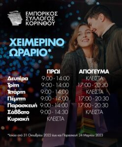 1_ΚΟΡΙΝΘΙΑ Δείτε το φετινό χειμερινό ωράριο των καταστημάτων στην Κόρινθο By SFEDONA 05/11/2022 ShareTweet 0