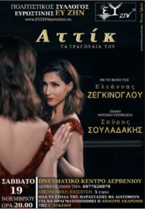 Το Σάββατο στις 19 Νοεμβρίου, όλα αυτά ζωντανεύουν ξανά μέσα από την υπέροχη φωνή και τις αφηγήσεις της Ελεάννας Ζεγκίνογλου και τα ατμοσφαιρικά πιάνα του καταξιωμένου σολίστα Σπύρου Σουλαδάκη, στον κλειστό χώρο του Πνευματικού Κέντρου Δερβενίου, με τη διοργάνωση του Συλλόγου Ευρωστίνης ΕΥ ΖΗΝ.