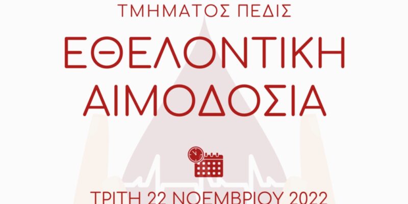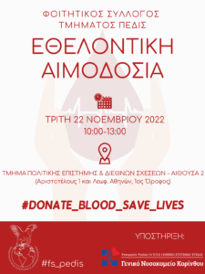 Εθελοντική Αιμοδοσία διοργανώνει ο Φοιτητικός Σύλλογος του Τμήματος Πολιτικής Επιστήμης & Διεθνών Σχέσεων. Η αιμοδοσία θα γίνει την Τρίτη 22 Νοεμβρίου 2022, από τις 10:00 το πρωί μέχρι την 1.00 το μεσημέρι, στην αίθουσα 2 του Τμήματος ΠΕΔιΣ.