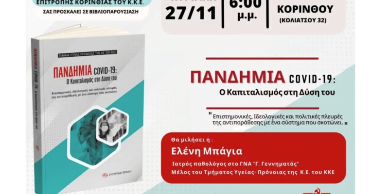 Η Κ.Ο.Β. Υγείας της Τομεακής Επιτροπής Κορινθίας του ΚΚΕ σας καλεί σε βιβλιοπαρουσίαση του βιβλίου «Πανδημία Covid-19: Ο Καπιταλισμός στη δύση του«
