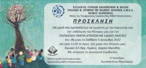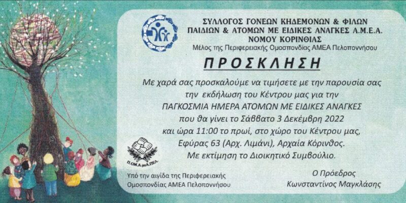 ΕΚΔΗΛΩΣΕΙΣ Ευθύμειο Κέντρο: Εκδήλωση για την παγκόσμια ημέρα ατόμων με αναπηρία By SFEDONA 23/11/2022 ShareTweet 0 Εκδήλωση πραγματοποιείται στο Ευθύμειο Κέντρο Κορίνθου, στις 3 Δεκεμβρίου και ώρα 11 το πρωί, με αφορμή την παγκόσμια ημέρα ατόμων με αναπηρία. Δείτε την πρόκληση