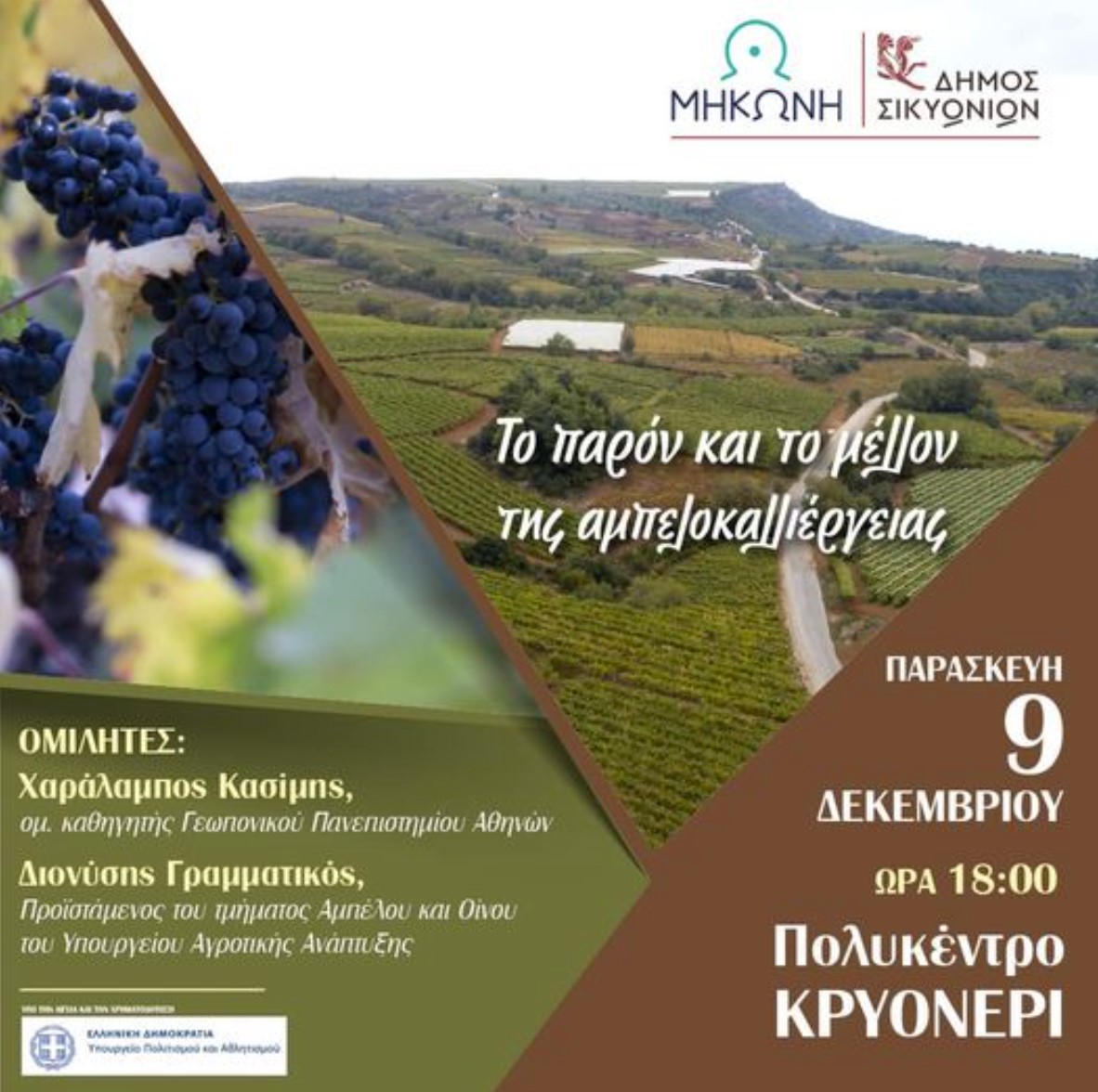 Την Παρασκευή 9 Δεκεμβρίου, ώρα 18:00, στο Κρυονέρι θα πραγματοποιηθεί μια σημαντική εκδήλωση για το παρόν και μέλλον της αμπελοκαλλιέργειας, με δύο σημαντικούς ομιλητές. Η εκδήλωση εντάσσεται στις “Δράσεις ανάδειξης της κορινθιακής Σταφίδας” ως στοιχείου Άυλης Πολιτιστικής Κληρονομιάς, που υλοποιεί το ΝΠΔΔ “Μηκώνη” του δήμου Σικυωνίων και τελεί υπό την αιγίδα του Υπουργείου Πολιτισμού και Αθλητισμού.