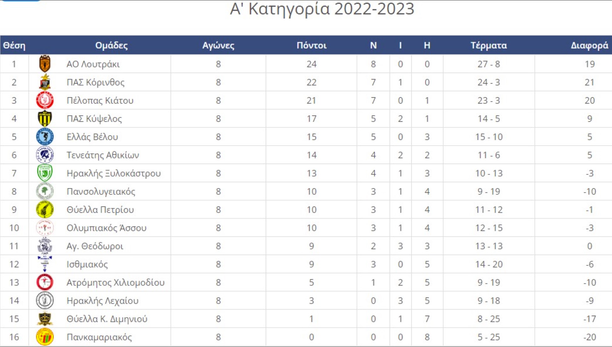 Δείτε την Βαθμολογία και τα αποτελέσματα των αγώνων της 8ης αγωνιστικής της Α΄ Κατηγορίας Κορινθίας .