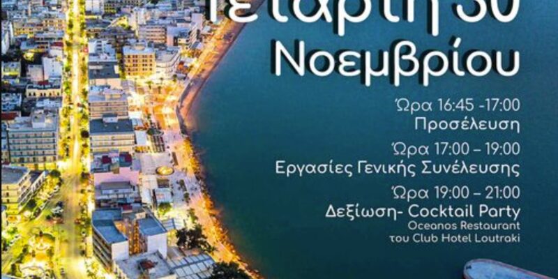 Σήμερα Τετάρτη 30 Νοεμβρίου 2022 στις 17:00 , θα πραγματοποιηθεί η ετήσια συνέλευση του Τουριστικού Οργανισμού Λουτρακίου, στην αίθουσα πολυχώρων στο Καζίνο Λουτρακίου, στην οποία θα παραβρεθεί ο Περιφερειάρχης Παναγιώτης Νίκας, ο δήμαρχος Λουτρακίου Γιώργος Γκιώνης, βουλευτές του νομού, περιφερειακοί και δημοτικοί σύμβουλοι.