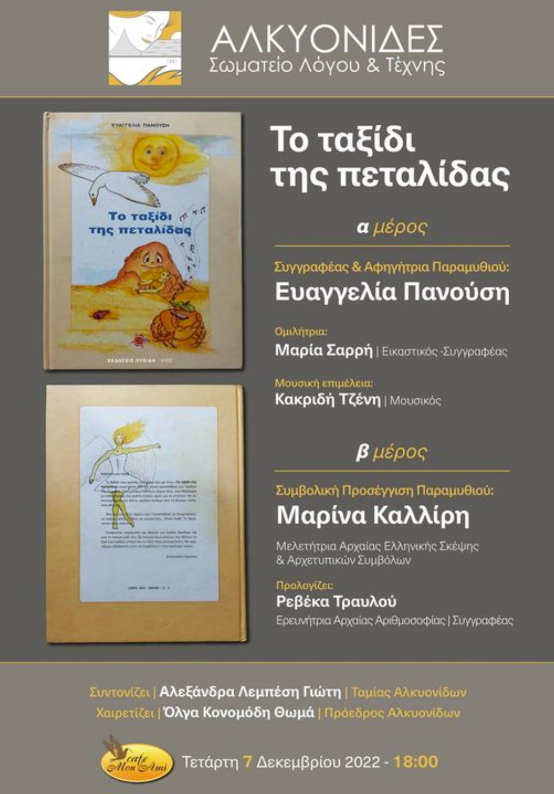 Την Τετάρτη 7 Δεκεμβρίου στις 6:00 μμ στο cafe Mon Ami (παραλία Καλάμια) η συγγραφέας-ποιήτρια -αφηγήτρια Ευαγγελία Πανούση θα παρουσιάσει το παραμύθι της και θεατρικό έργο “Το ταξίδι της Πεταλίδας” . Η αφηγήτρια είναι μέλος του σωματείου λόγου & τέχνης “Αλκυονίδες” , το οποίο αναφέρει μεταξύ άλλων για την εκδήλωση: “-Στο πρώτο μέρος θα ακούσουμε την πραγματικά ιδιαίτερη πορεία της Πεταλίδας από την αρχή της συγγραφικής σύλληψης μέχρι και την έκδοση της .