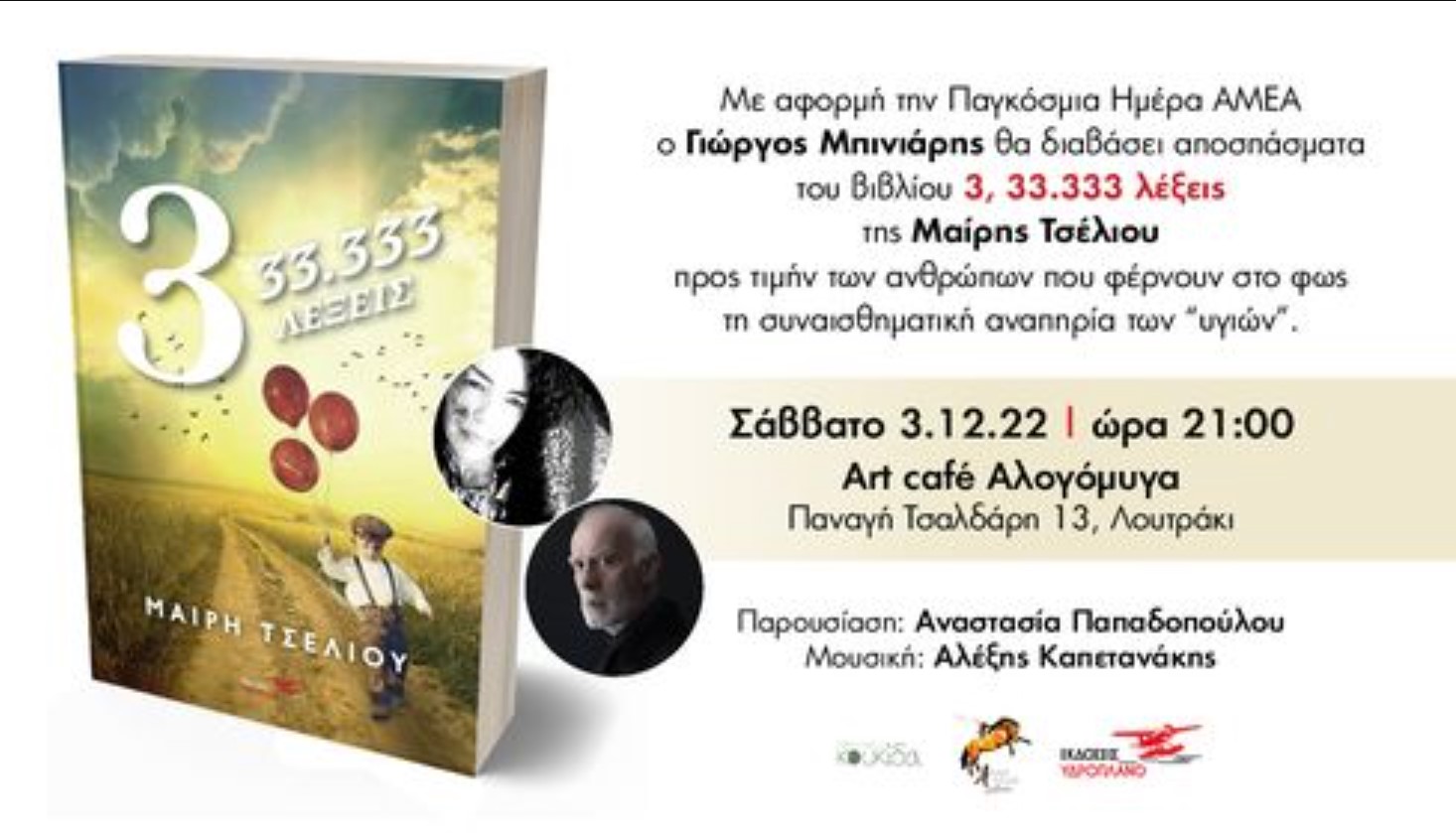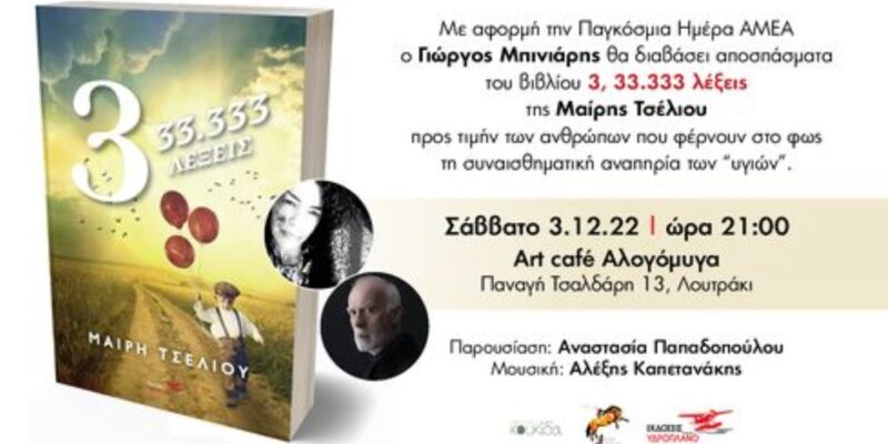 Αποσπάσματα από το βιβλίο της Μαίρης Τσέλιου “33.333 ΛΕΞΕΙΣ” θα διαβάσει αύριο Σάββατο 3 Δεκεμβρίου 2022, ο Γιώργος Μπινιάρης, με αφορμή την Παγκόσμια Ημέρα ΑΜεΑ, προς τιμήν των ανθρώπων που φέρνουν στο φως την συναισθηματική αναπηρία των “υγιών”