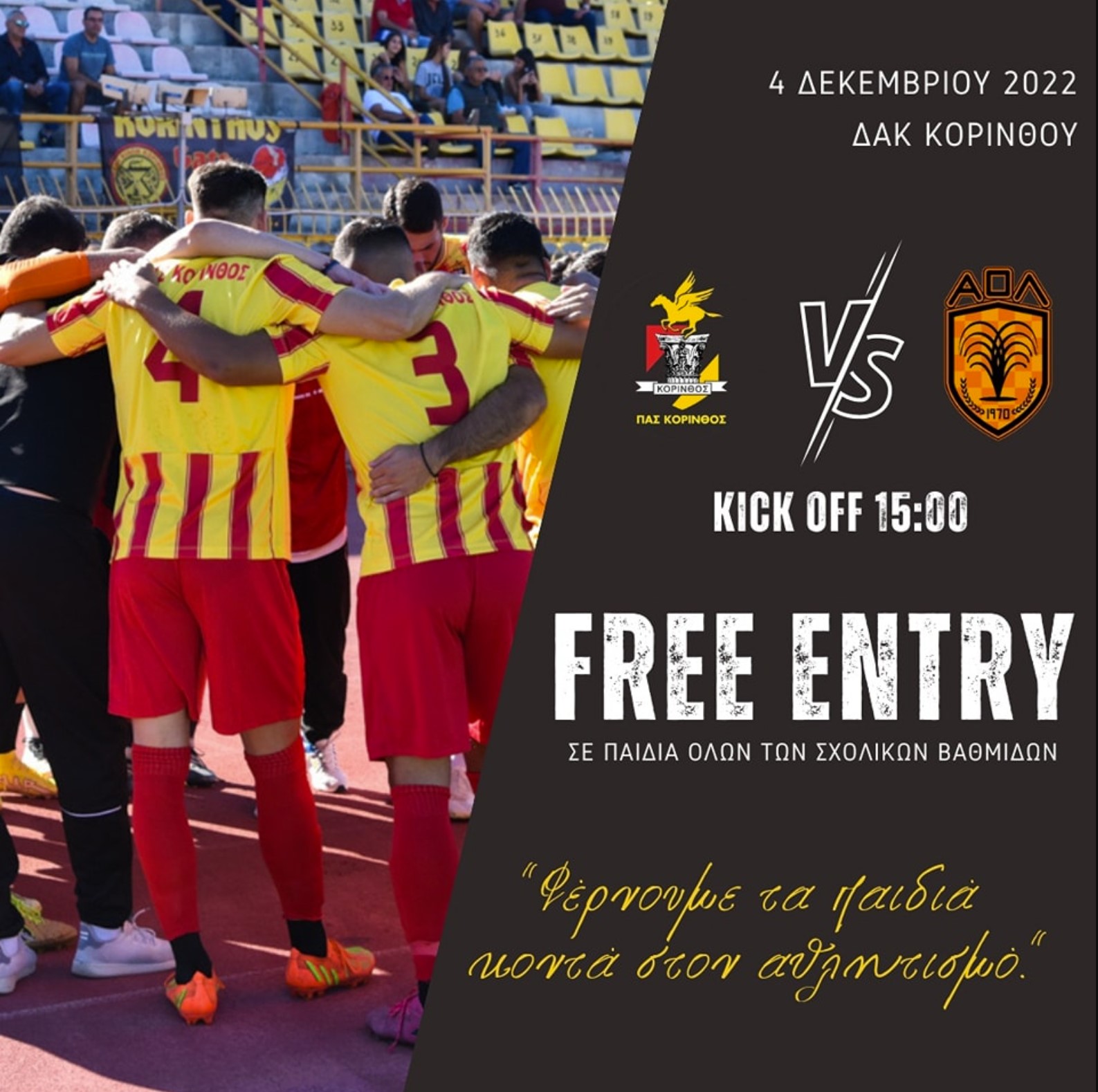 Προσκαλούμε τους μαθητές όλων των βαθμίδων από τα σχολεία του νομού Κορινθίας να παρακολουθήσουν ΔΩΡΕΑΝ τον αγώνα, όπως και κάθε αγώνα της ομάδας μας.