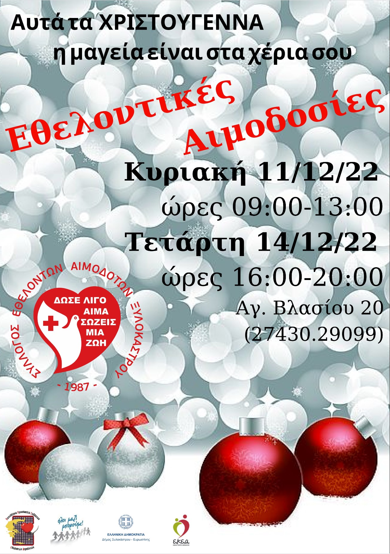 Τα Χριστούγεννα πλησιάζουν και η προσφορά αίματος κατά την εορταστική περίοδο είναι μειωμένη. Με