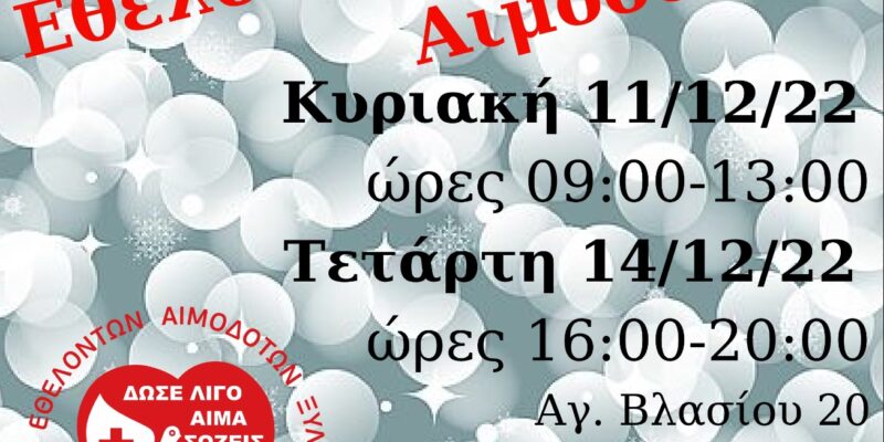 την Κυριακή 11/12/2022 από 09.00 έως 13.00 και